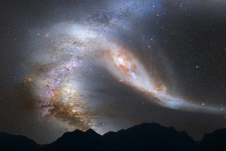 Bild: Kollision von Milchstraße und Andromedagalaxie in etwa vier Milliarden Jahren, künstlerische Darstellung (Bildnachweis: NASA, ESA, Z. Levay und R. van der Marel (STScI ), T. Hallas und A. Mellinger)